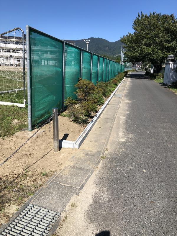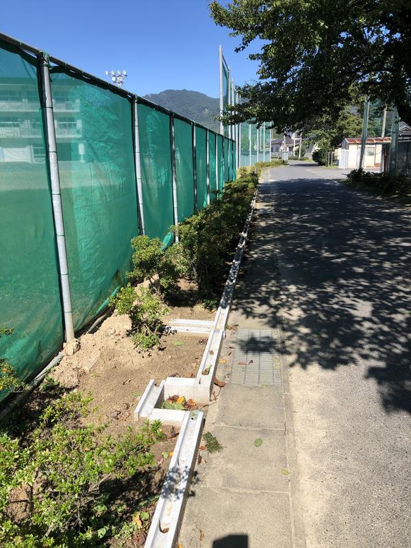 校庭東側の植え込みと道路の境に、仕切りブロックを設置してもらいました。(今週完成)