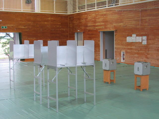 立会演説の後、小川支所から借用した投票用紙記載台と投票箱を使って、