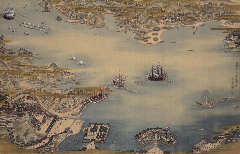 江戸時代の長崎湾を描いた古地図(手前のおうぎ形の地域が〝出島〟)