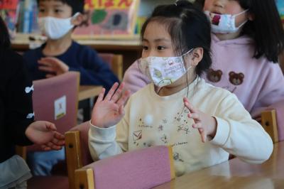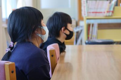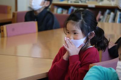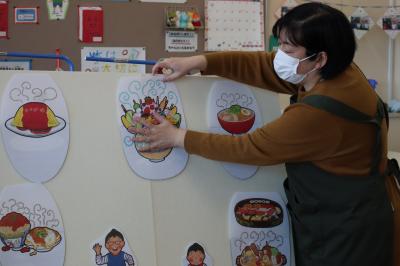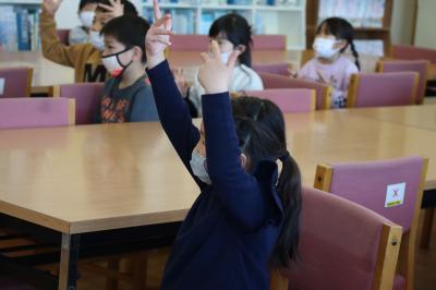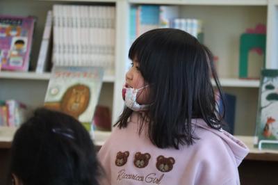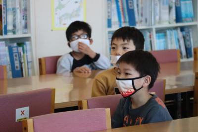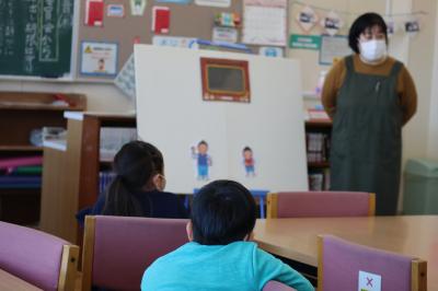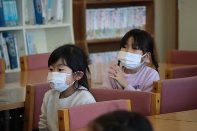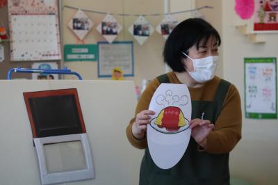 2021年2月26日 16時23分学校司書の吉田先生が、1年生にパネルシアターによる「読み聞かせ」をしてくださいました。食べたいごちそうをお願いし、お皿を電子レンジに入れ魔法の歌を歌うと・・・。