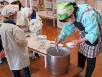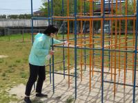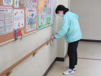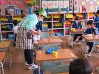 松﨑さんには、さっそく、印刷作業・遊具の消毒・校舎内の手すりの消毒・給食前のテーブルの台ふき・1年生の給食配膳の補助を手伝っていただきました。
