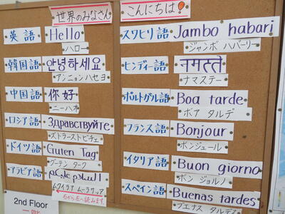 二階東側壁面には、「世界のみなさん こんにちは」が掲示されています。