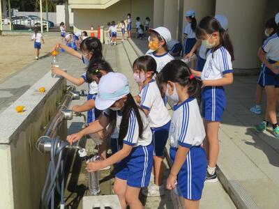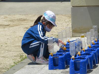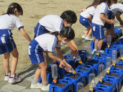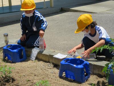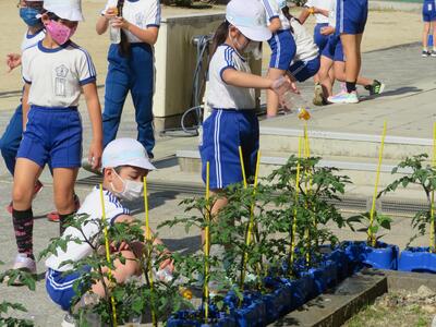 育てているミニトマトやヒマワリなどに、たっぷりの水を与えている児童たちです。