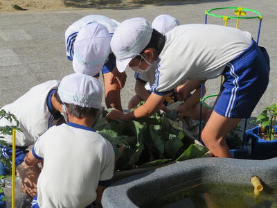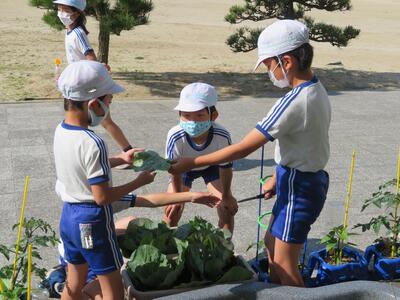 3年生はキャベツの葉についているモンシロチョウの幼虫を見つけました。
