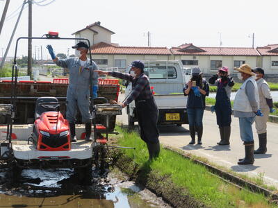まずは、講師の先生方に、田んぼの周りに田植え機で植えてもらいました。