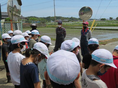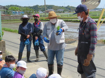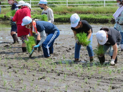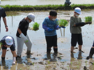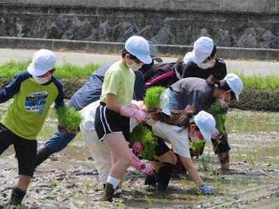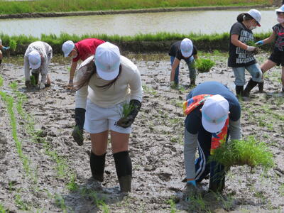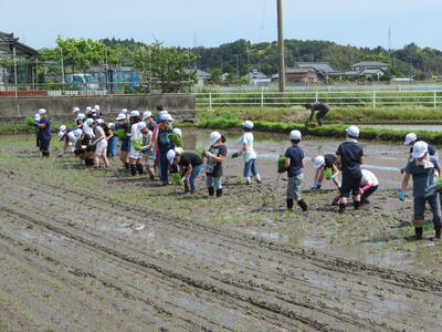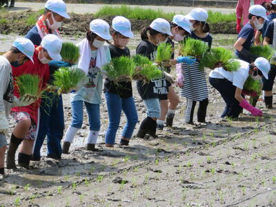 5月26日 五月晴れの下、5年生が総合的な学習で「田植え体験」を行いました。