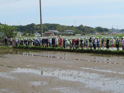 田んぼに入ると、軟らかい土の感触に、みんな思わず「うわーっ」という声をあげていました。