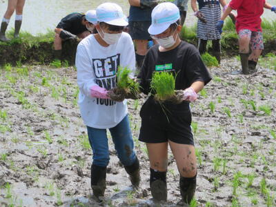 軟らかい土に足をとられながら、一生懸命田植えに取り組みました。