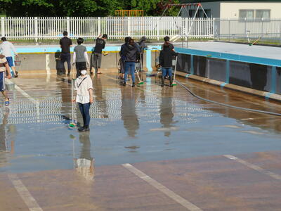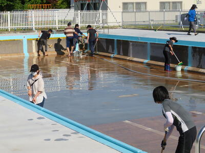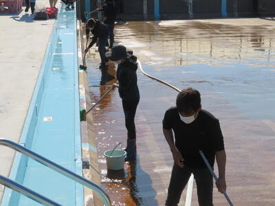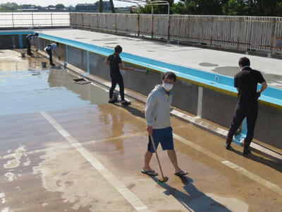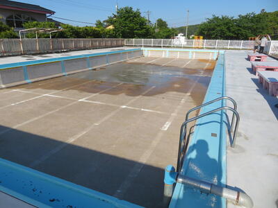 昨年度末にプールサイド補修工事を行い、その時にたまっていた泥水をとっていたので、プールは比較的きれいでした。