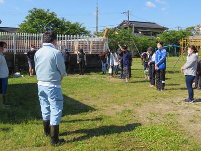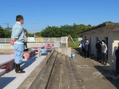 PTA会長さんからご挨拶をいただき、早速プール清掃開始です。