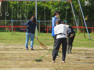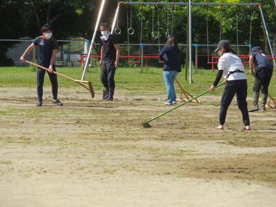 予定外の作業として、27日(金)の雨で荒れてしまった校庭整備もしていただきました。
