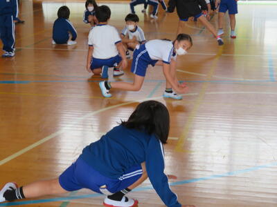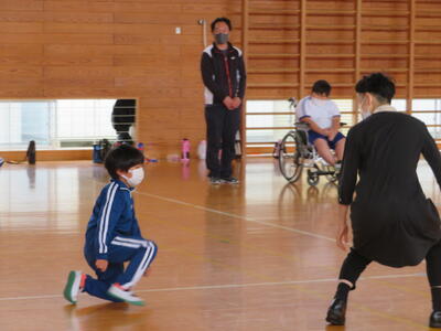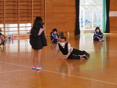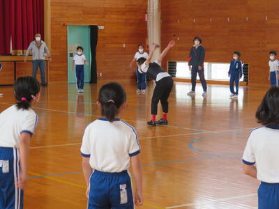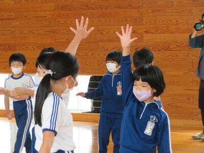 まずは、みんなで輪になって、講師の方の動きに合わせる身体表現を行いました。