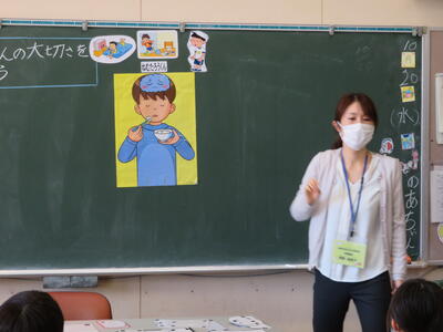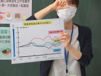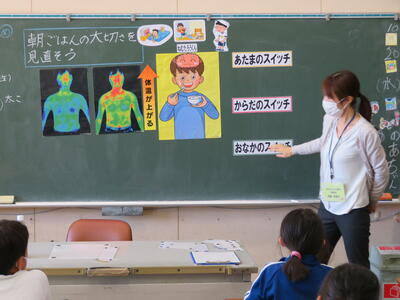 先日は5年生で行いましたが、今回は3年生バージョンで「朝食の大切さ」を教えていただきました。