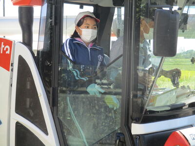 まずは、刈りやすいように周りを大型コンバインで刈りました。児童の代表が特別に乗せてもらいました。