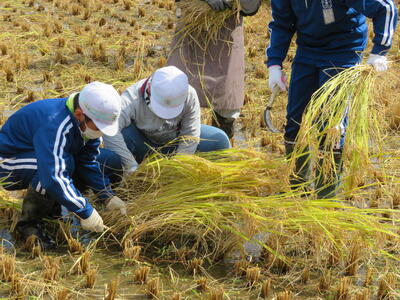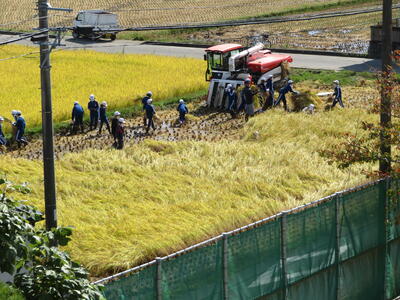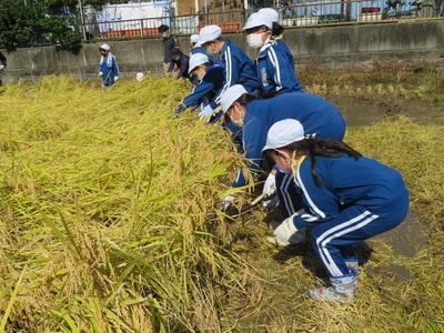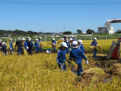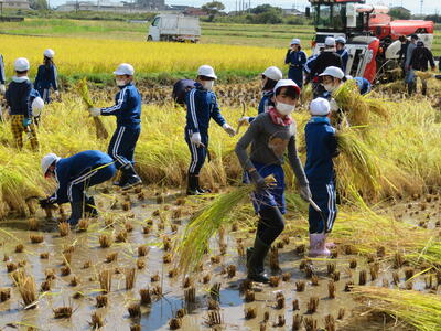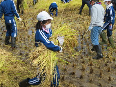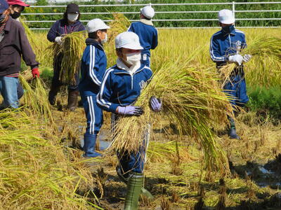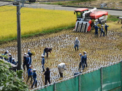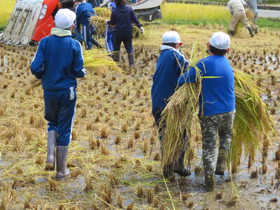 さて、続いて5年生が3・4校時目に体験したのが、「稲刈り」です!