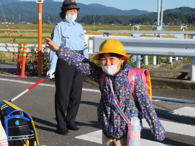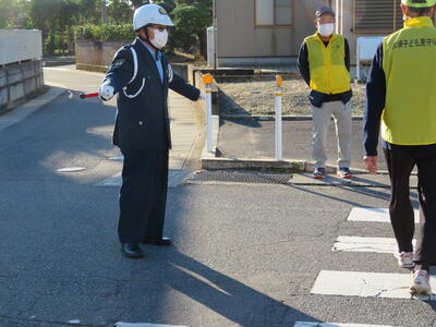 その児童の安全を守るために、交通指導員の方々に立哨指導をしていただいています。