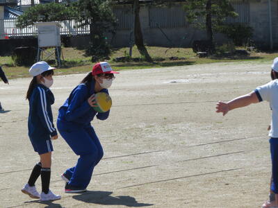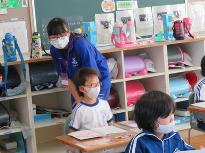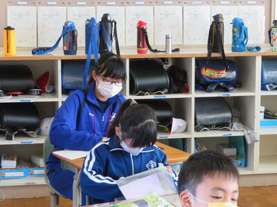 休み時間にはさっそく児童たちが中学生の周りに集まり、いっしょに遊んでいました。