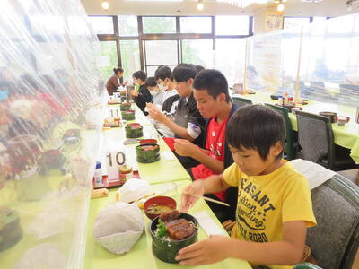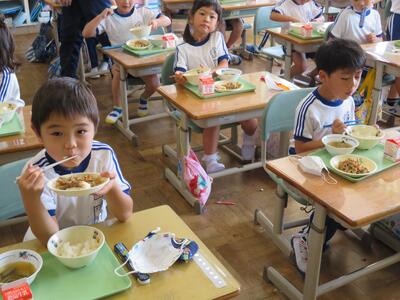 「久しぶりのごはん、おいしい人ーっ!」と声をかけたいところですが、黙食、黙食。がまんです。