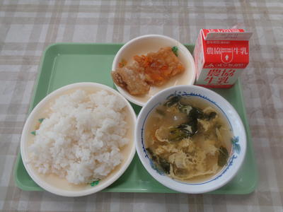 今日の給食の献立は、ごはん・牛乳・とり肉ガーリックソースかけ・かきたま汁です。総カロリーは、614Kカロリーです。