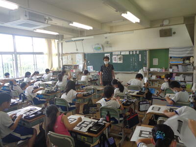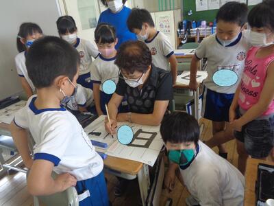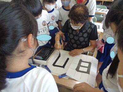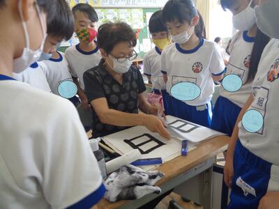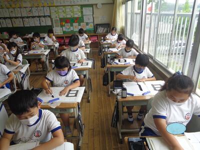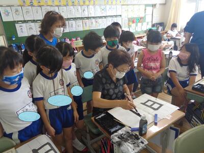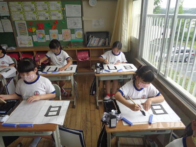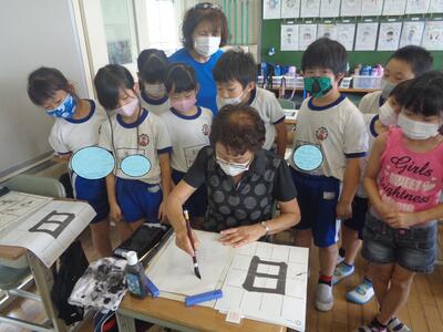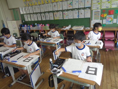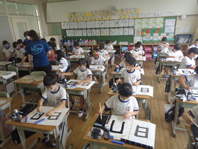 2021年7月5日 11時23分3校時目、3年生は毛筆の授業でした。丹美枝先生に来ていただき、ご指導をいただきました。題材は、「日」です。この文字のポイントは、「折れ」。穂先の向きや動かし方を、具体的に教えていただきました。また、名前の書き方についても分かりやすく教えていただきました。子ども達も、自信を持って書くことができるようになってきました。