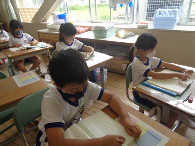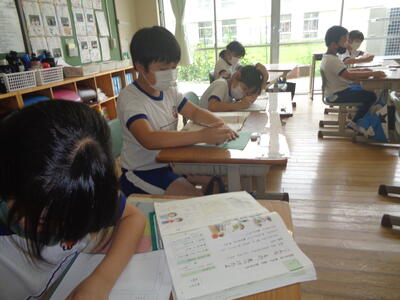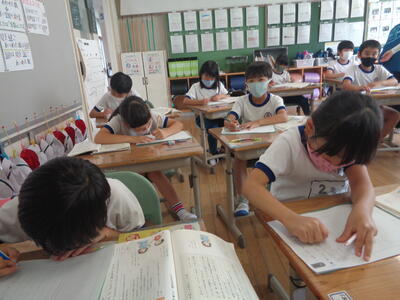 2021年7月5日 15時33分4校時目、2年生は1・2組とも国語の授業を行っていました。1組は「こんなもの みつけたよ」、組み立てを考えて友達に伝えたいことを書く学習です。メモをとる学習を生かしながら、書くことができていました。2組は物語「ミリーのすてきなぼうし」の指差し読みです。朗読に合わせて指でなぞりながら読み進めていました。書くこと・読むことに磨きをかけるために、一時間一時間の授業を大切にしていきたいと考えています。