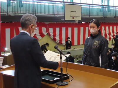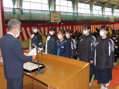 卒業式予行練習の前に、表彰の伝達を行いました。3年生にとっては、中学校最後の表彰式となります。