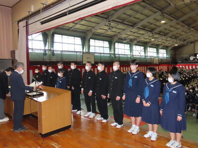 2024年3月8日 18時20分卒業式予行練習の前に、表彰の伝達を行いました。3年生にとっては、中学校最後の表彰式となります。