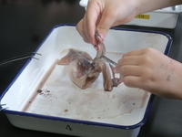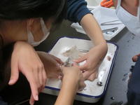 イカを解剖しながら、腕や口、目、内臓などのつくりを観察しました。