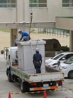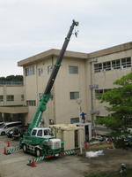 まずは、古いキュービクルを撤去します。重機を使っての撤去です。