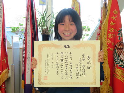 このなかで「作文の部」に応募した本校1年の小野久瑠美さんの作品が優秀賞を受賞し、昨日いわき市文化センターで行われた表彰式に出席しました。