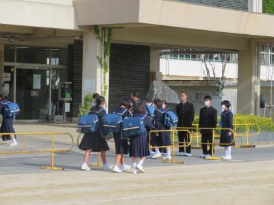 生徒の皆さんが登校してきます。週番の生徒の皆さんが朝のあいさつ運動を行っています。