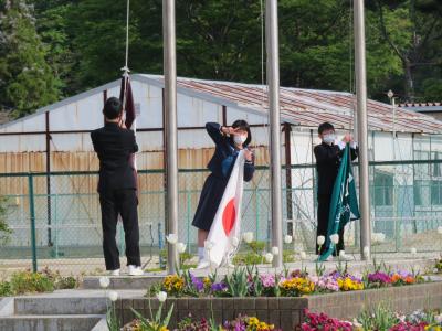 生徒会役員の皆さんが、国旗・市旗・校旗を揚げています。