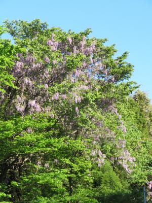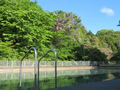 夜中まで降っていた雨もあがり、すっきりと晴れわたっています。プール脇の藤の花がきれいに咲いています。