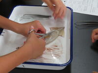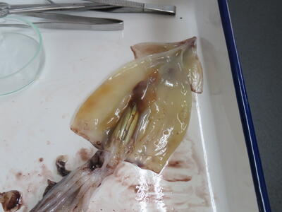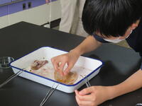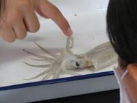 実際に解剖を行いながら、イカのからだのつくり(口・目・心臓・胃など)を観察しました。