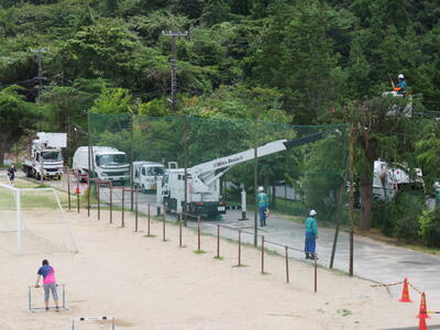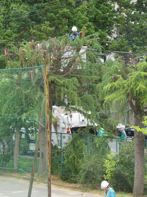 校庭の西側にある樹木の枝が伸び電線にかかったため、東北電力さんが剪定を行って下さりました。