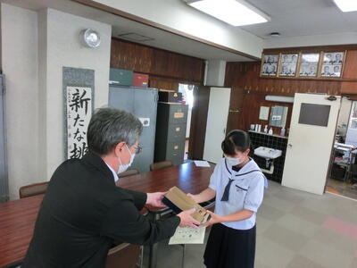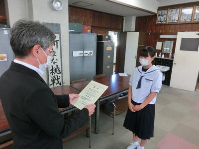 本日、報告を受け、校長室で表彰を行いました。