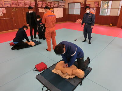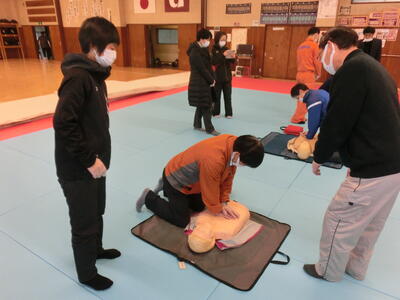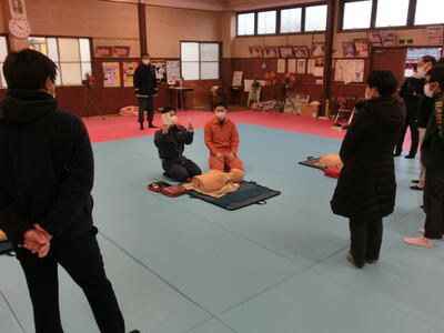 特に本校は、小学校と隣接しているので、小さな子ども向けの講習も行いました。大人には両手で行う心肺蘇生ですが、子どもには圧迫が強すぎるので、片手で行います。両手よりも体力を使うので、複数で交代しながら行うことが必要のようです。ポイントを教わりながら実践しました。