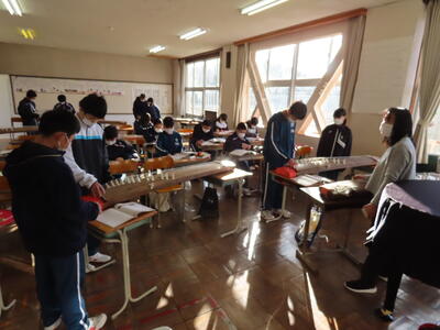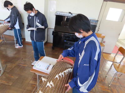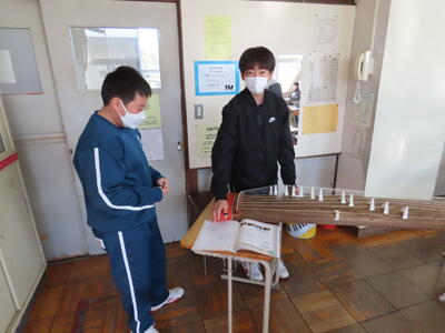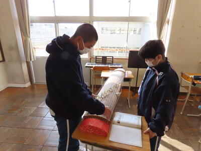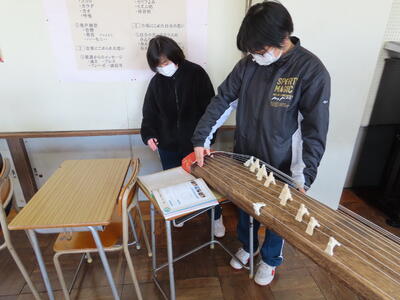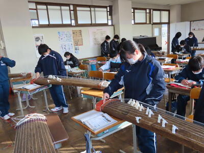 2023年1月27日 19時56分1年生の音楽。日本文化の“箏曲”に取り組んでいます。はじめて触れる生徒が多く、戸惑う様子も見られましたが、ペアを組んで互いに音階をアドバイスしながら、繰り返し練習していました。