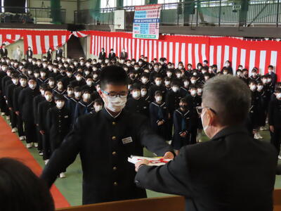各学年代表者に教科書が授与されました。(今日は、すべての教科書に「名入れ」をすることが宿題となりますね。)