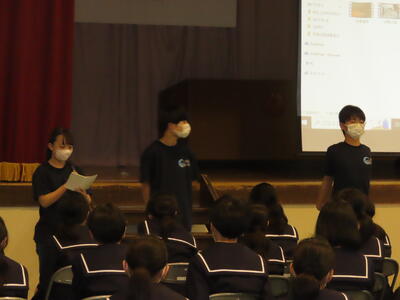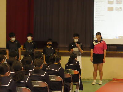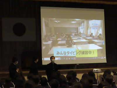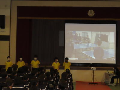 2023年4月8日 10時38分7日(金) 生徒会による対面式が体育館で行われました。コロナの影響で、ここ3年間は代表生徒や映像で新入生に学校の様子を伝える機会となっていましたが、以前のように新入生と実際に「対面」する中で実施されました。