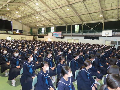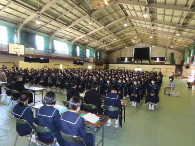 2023年4月28日 19時55分第1回 生徒会総会が開かれました。全校生が体育館に集まって行うのは、実に4年ぶりで、3年生も初の体験となりました。