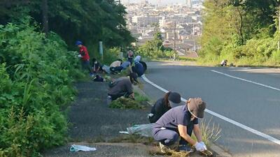 校地内だけでなく、通学路の歩道の除草も行いました。