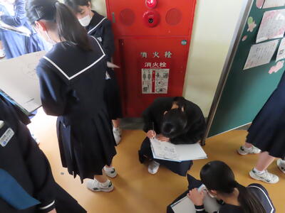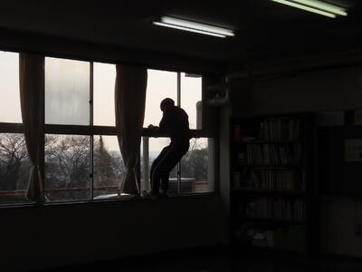 卒業を控え、3年生は中学校で最後の愛好作業。日中、大掃除をし、放課後にワックスがけをしていました。先ほどの人影は、教室の奥に取り残され、床に足をつくことができなくなってしまった光景でした。(「考えてワックスをぬることが大事だ」という先輩からのメッセージですね)