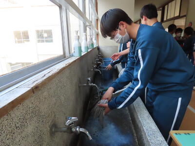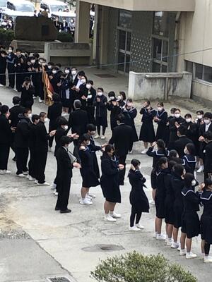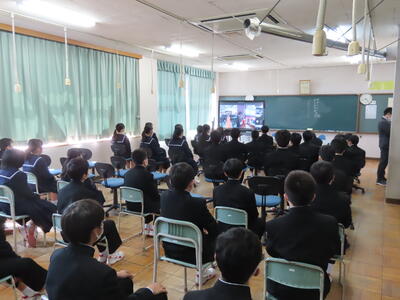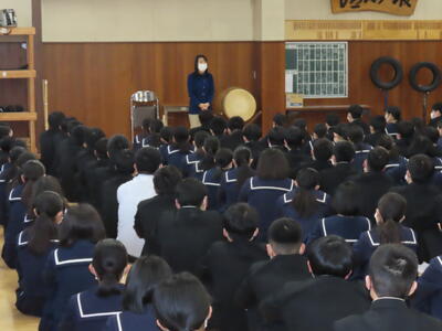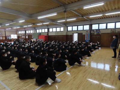 学年集会では、学年の先生方一人一人から、最後のお話をいただきました。生徒一人一人がいろんな思いで過ごしてきた3年間があるように、先生方にもそれぞれにさまざまな思いや願いをもって、生徒たちと過ごしてきました。生徒たちと共に過ごしてきた思いを生徒たちに伝えました。