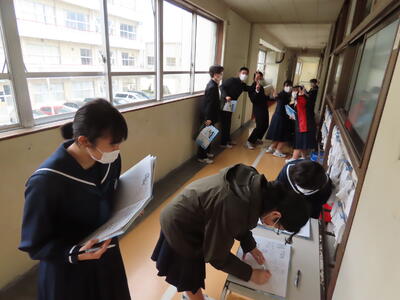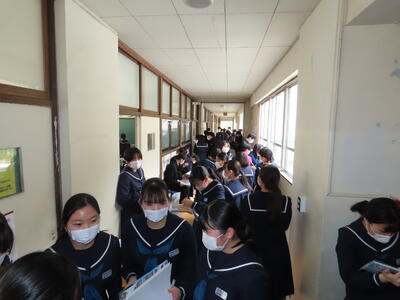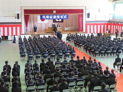 卒業式当日は、卒業生と保護者、代表生徒、来賓、職員のみの参列となります。2年生はオンラインでの参加です。予行は、2年生が参列し、1年生がオンラインで参加となりました。
