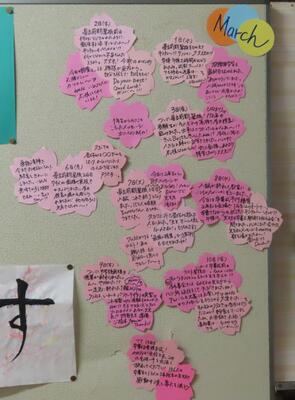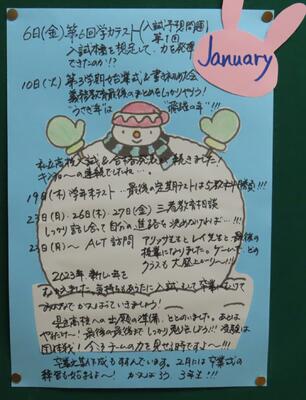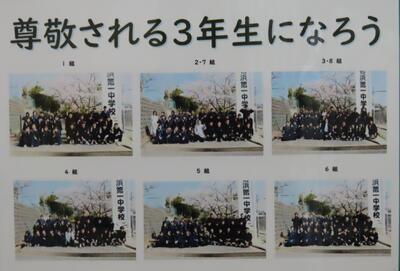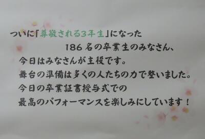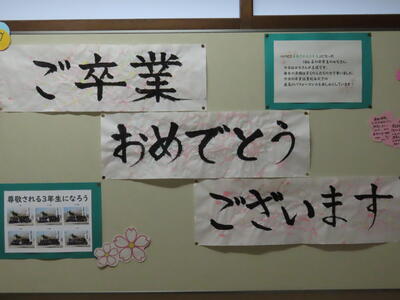 2階中央廊下に飾れらました。とっても心が温かくなる作品です。先日は、1年生から各学級にメッセージが贈られましたが、在校生、そして教職員全員で3年生の門出を祝っています。残り4日となった中学校生活ですが、これからの1時間、1分、1秒をかみしめて生活してほしいと思います。