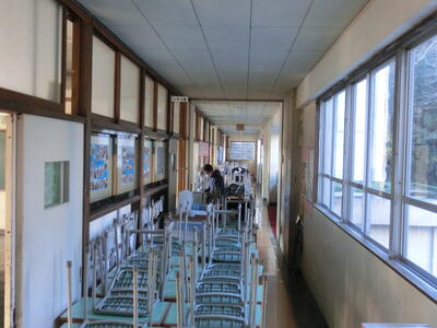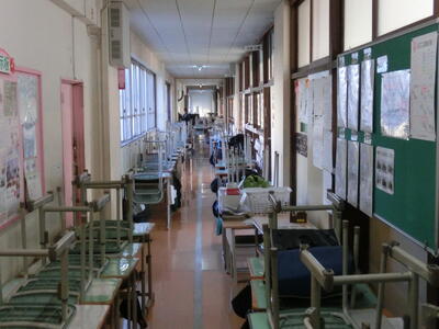 12月16日(金) 放課後に今年2回目のワックスがけを行いました。各フロアの廊下には、教室の荷物が所狭しと並んでいます。