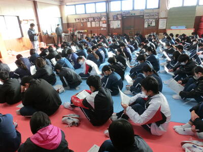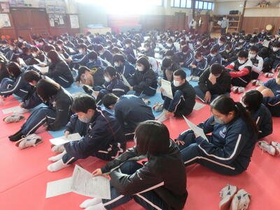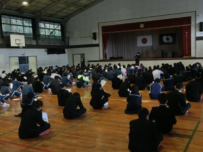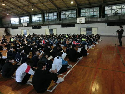 学年集会の様子です。学力テスト終了後の時間に行いました。みんな真剣に話を聞いています。
