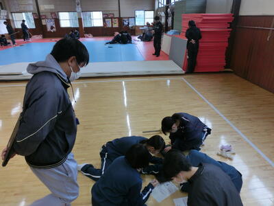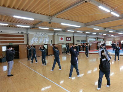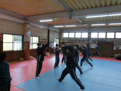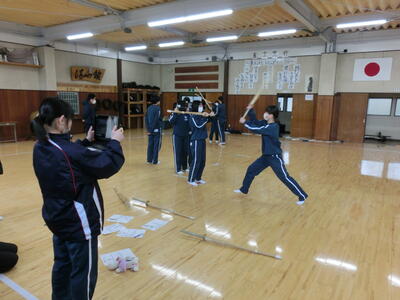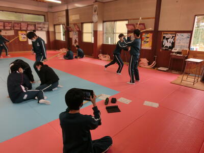 清心館では、保健体育で剣道の研究授業が行われました。多くの先生方が参観する中、一生懸命竹刀を振ります。