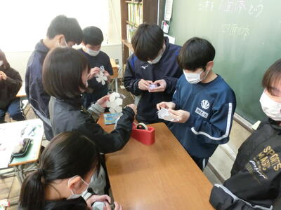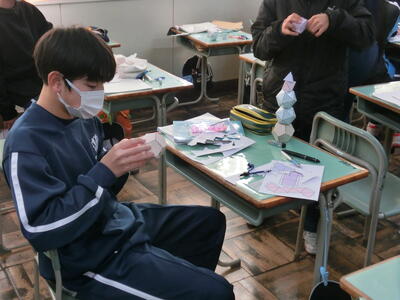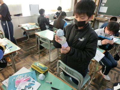 数学の様子です。教科書付録の多面体の模型を作っています。